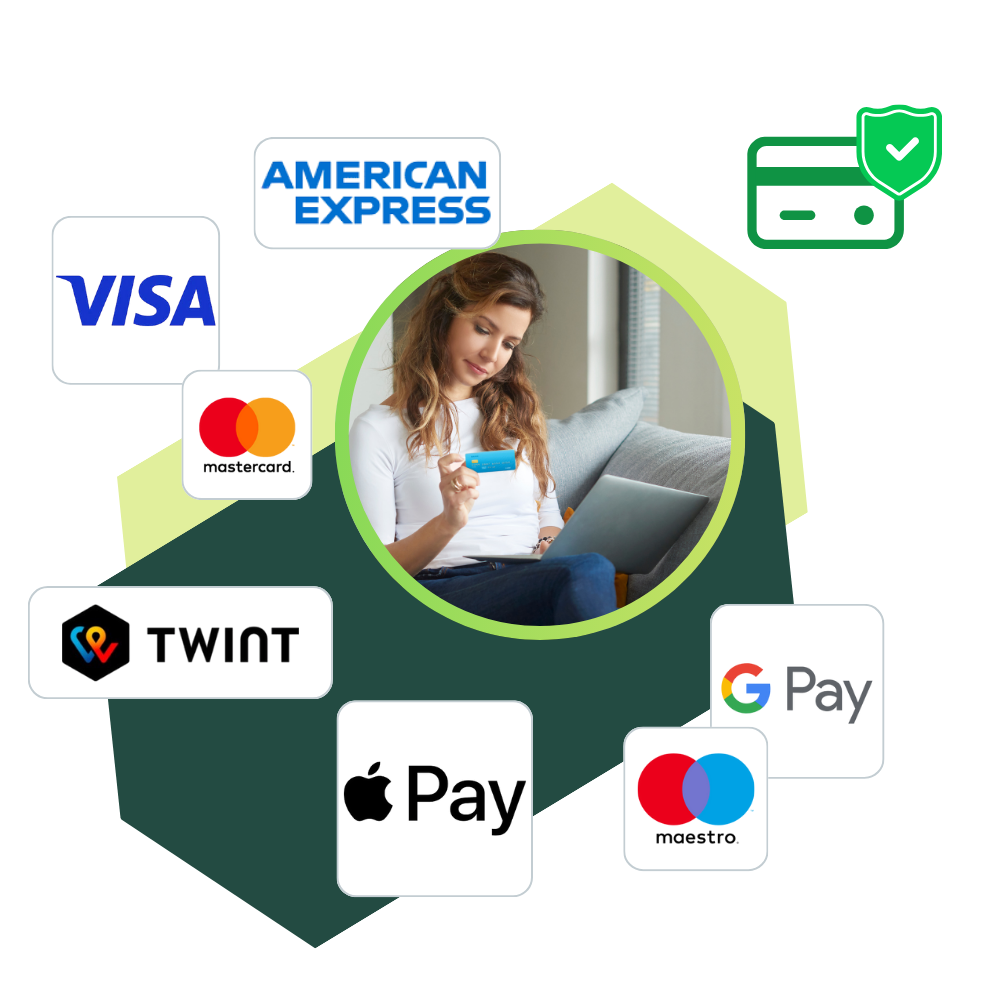 ApplePay, GooglePay, TWINT, Visa, American Express, maestro und mastercard